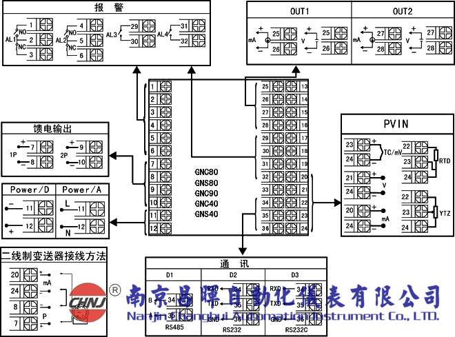 顯示控制儀型號(hào)舉例9:顯示+通信+2個(gè)報(bào)警+1路DC24V饋電+AC220V供電